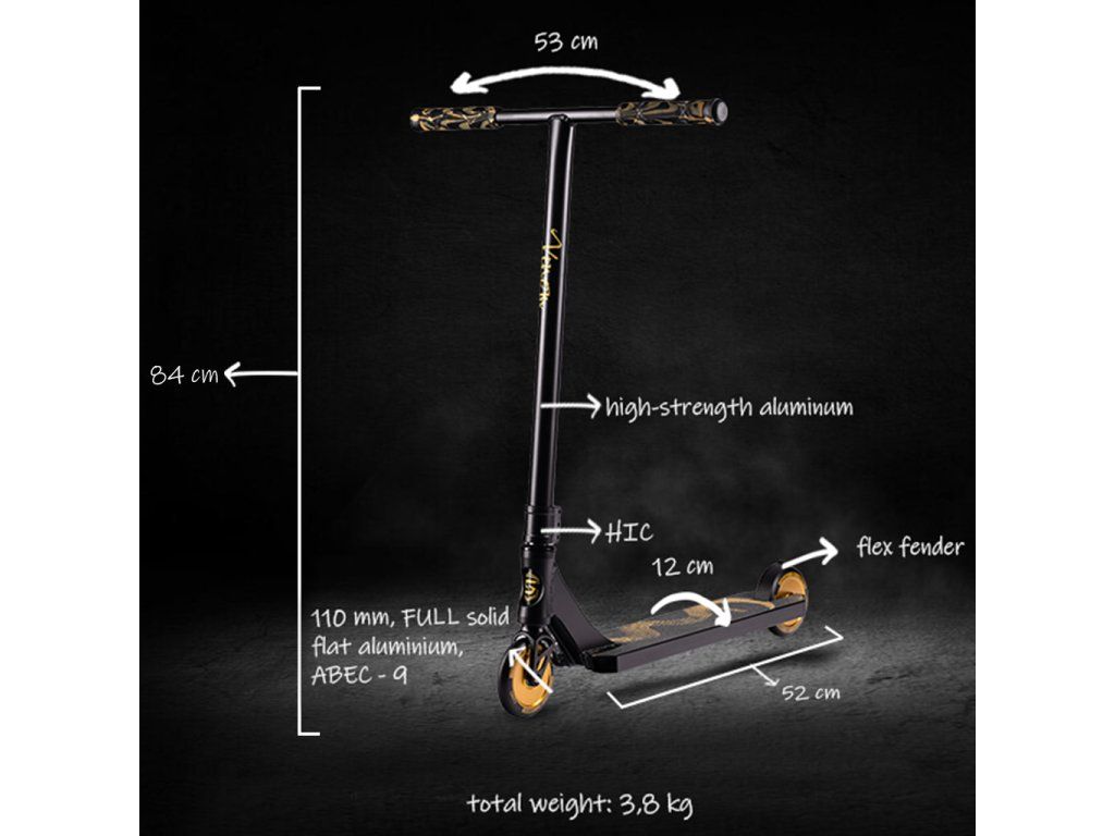 We didn’t want to create just another ordinary scooter. We wanted to build a “gold tank”. We know that when you’re jumping big gaps on stairs or grinding rails, you need one hundred percent confidence that the material will support you. That’s why VENOM Gold stands on elite 110 mm wheels with a full aluminum core – Full Solid Flat Aluminium without any weakening cutouts. Together with the solid construction of the T-bar handlebars and the professional HIC compression system, we built a 3.8 kg weapon that obeys you instantly in the air.